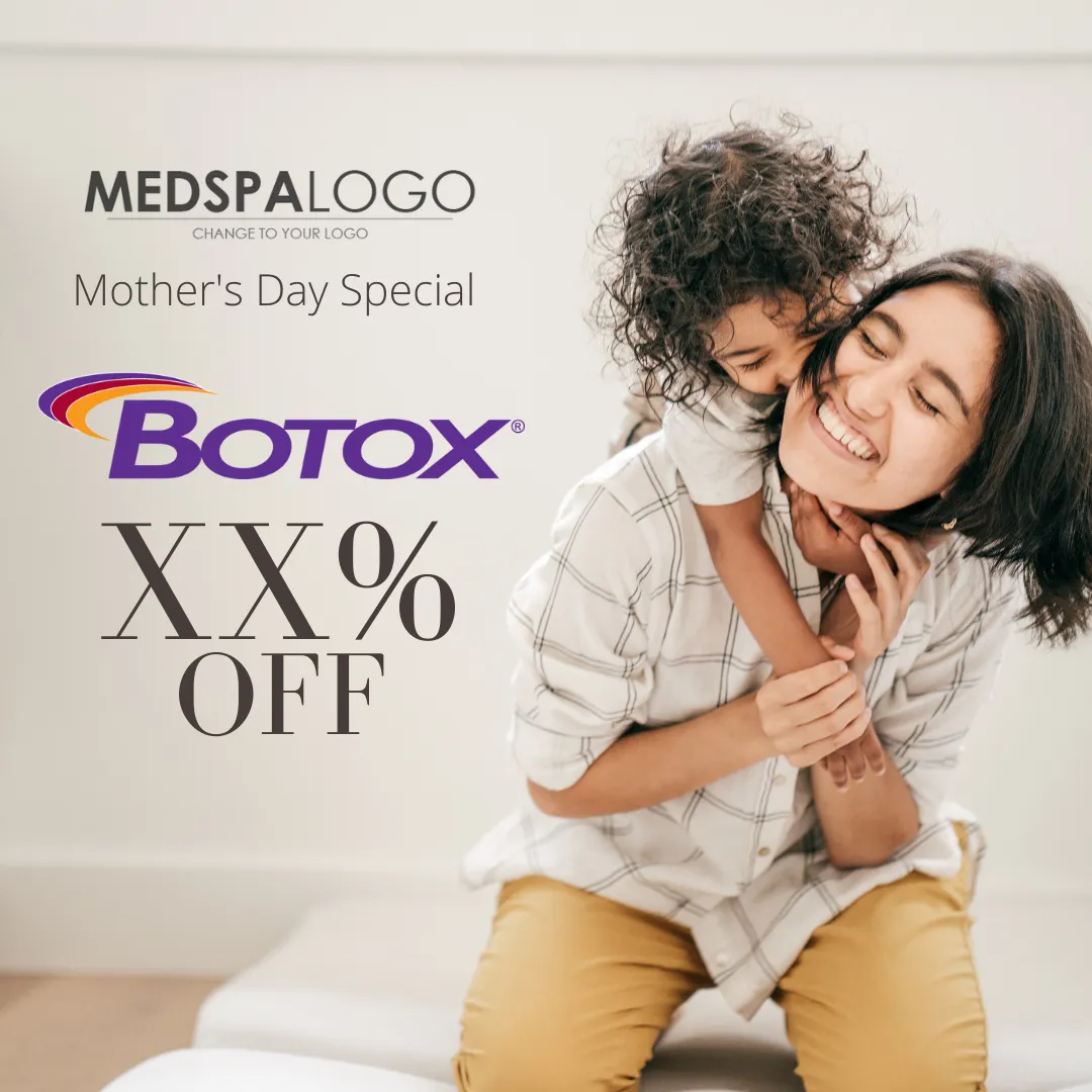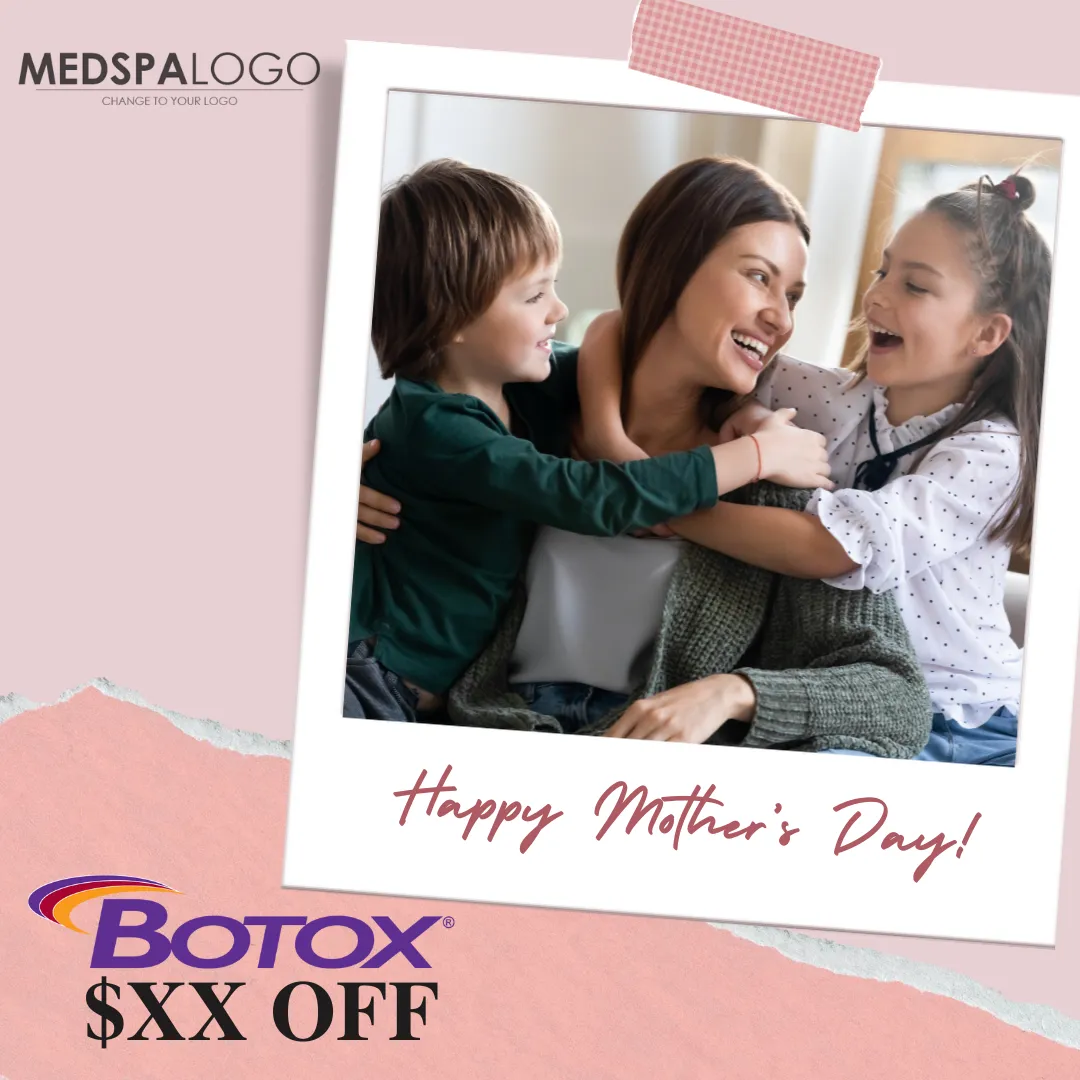 A joyful Mother’s Day ad capturing hugs, smiles, and Botox savings.